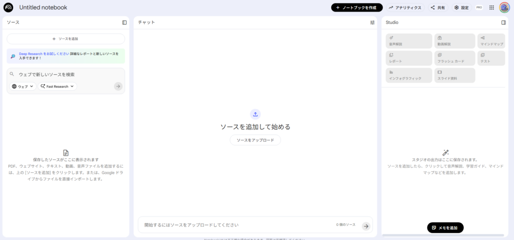NotebookLMを使用してスライド資料を作成する流れとしては下記の通りになります。