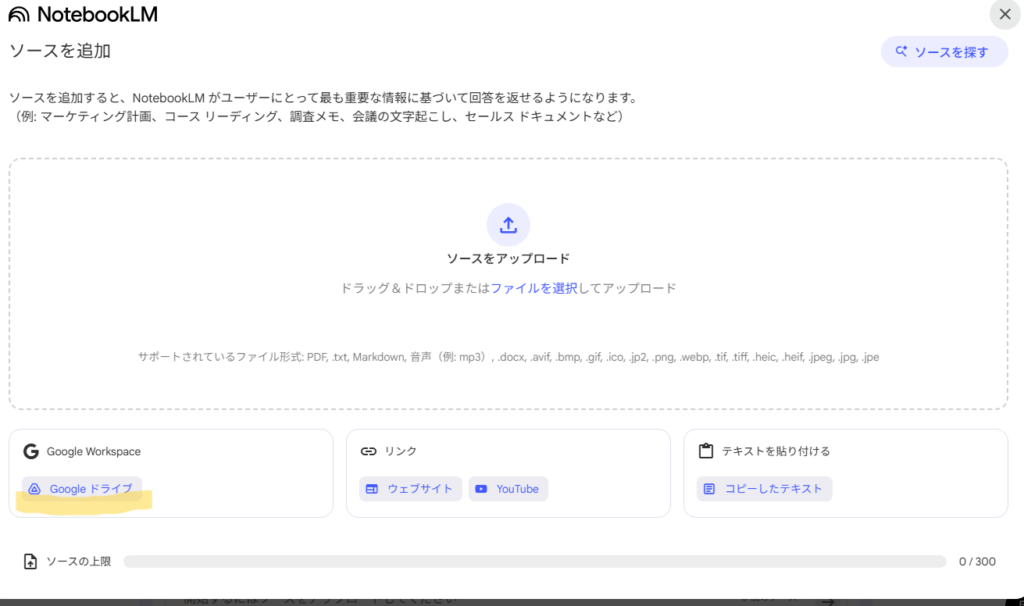 NotebookLMのノートブック新規作成からソースの追加でGoogleドライブに保存したあるドキュメントを読み込みます。