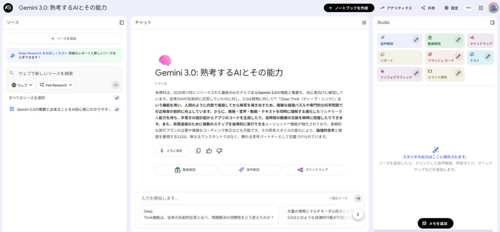 まずは、NotebookLMにスライド資料の元となる情報を取り込みます。この情報はYouTubeの動画やWEBサイトのリンクなどでもいいのですが、前回までの記事で作成したスライドと比較するという意味を込めて、「Gemini3.0の概要と出来ること」で作成した情報をGoogleドキュメントに保存していたのでそちらを使用します。