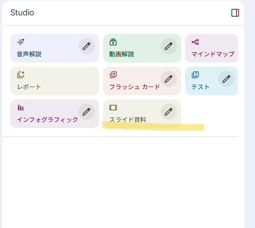 元となる情報を読み込んだら、NotebookLMの右側のメニューに「スライド資料」とあるのでこちらを押すことで生成が可能になります。