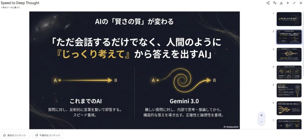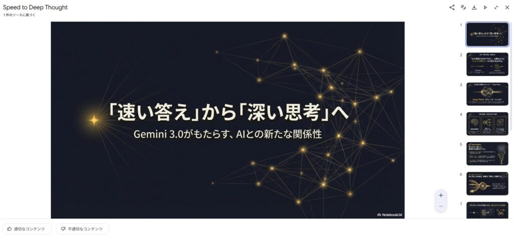今回は、Google NotebookLM単体でスライド資料を作成しましたが、Geminiで生成したものと比べるとかなり見た目はいい感じになっている気がします。どちらがいいかは好みになるのかもしれませんが、スライド資料が簡単に生成できる方法がいくつかあるのは本当に驚きです。