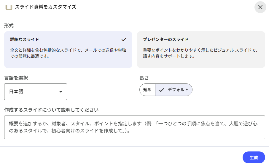 そのまま作成してもいいのですが、「スライド資料」の中にある鉛筆みたいなマークを押すと、「スライド資料のカスタマイズ」ということでスライドに関する詳細設定を行うことが出来ます。こちらでスライド資料の構成についての情報を追加していきます。この構成については、前回の記事でパワーポイントの構成法についてNotebookLMでまとめたものがあるので、そちらをコピーして使用します。