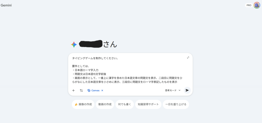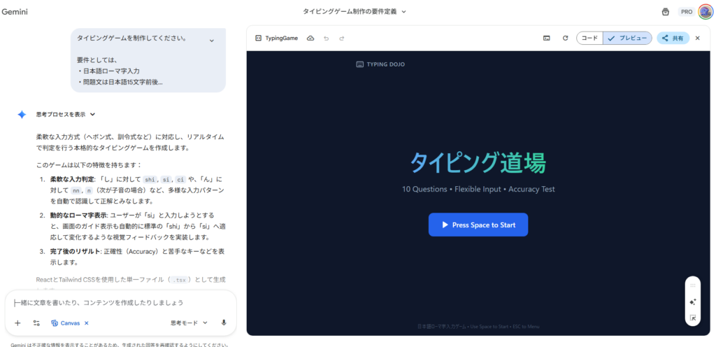 まずは、Geminiにタイピングゲームの制作を指示します。