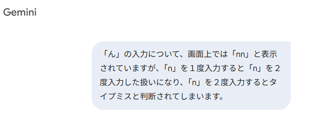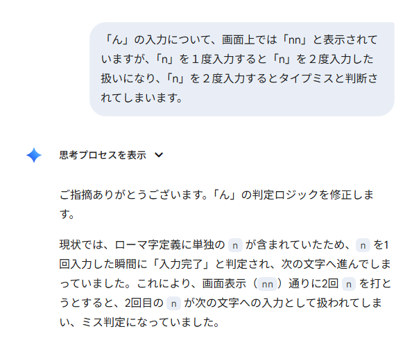 特に問題なく制作できていると思いましたが、「ん」の入力について、画面の表示は「nn」となっているのに、「n」を1度打つと2度入力した扱いになってしまい、「n」を2度打つと入力ミスの判定になっていることがわかりました。