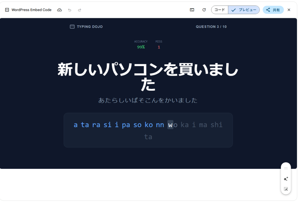 ・画面の表示として、一番上に漢字を含めた日本語文章の問題文を表示、二段目に問題文をひらがなにした日本語文章を小さめに表示、三段目に問題文をローマ字表記したものを表示
