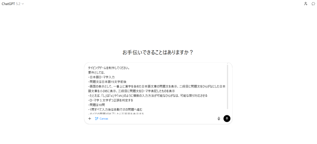 いつもの通り、ChatGPTにタイピングゲームの制作を指示します。プロンプトとしてはGemini3.0で制作したときに使用したものをそのままコピーします。