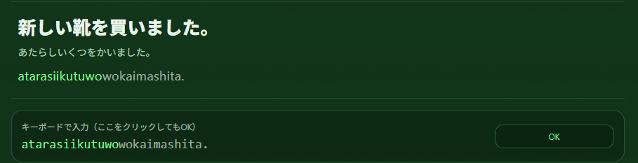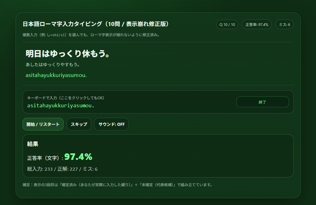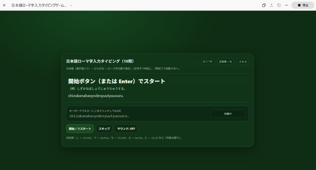 Gemini3.0で制作したときは、初回の生成時に「ん」の入力についてちょっとした問題があり、修正依頼によりある程度完成しました。今回のChaGPT5.2でも、初回の生成時にローマ字の表示上の問題があり、修正依頼をすることである程度完成しています。