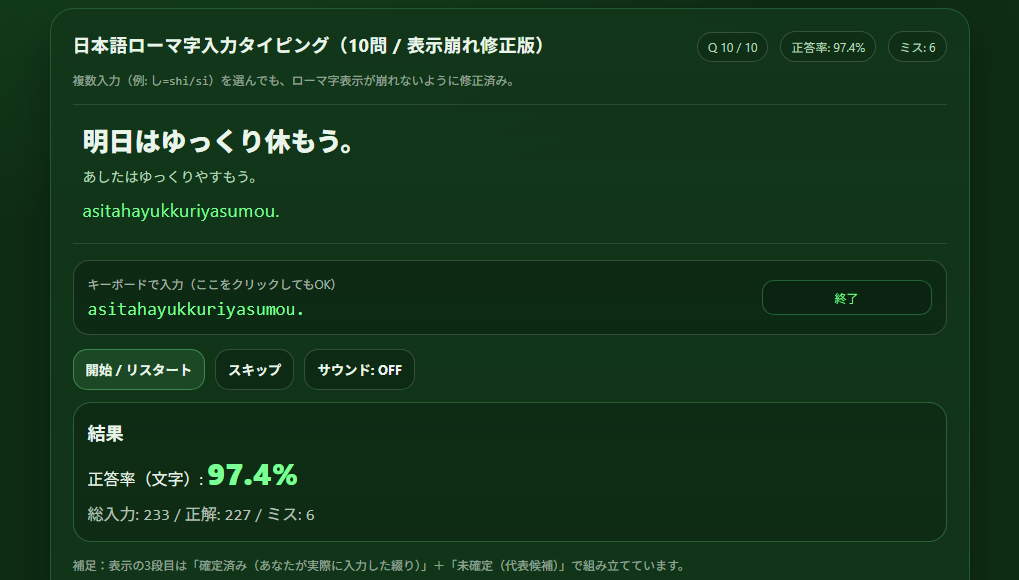 Gemini3.0で制作したときは、初回の生成時に「ん」の入力についてちょっとした問題があり、修正依頼によりある程度完成しました。今回のChaGPT5.2でも、初回の生成時にローマ字の表示上の問題があり、修正依頼をすることである程度完成しています。