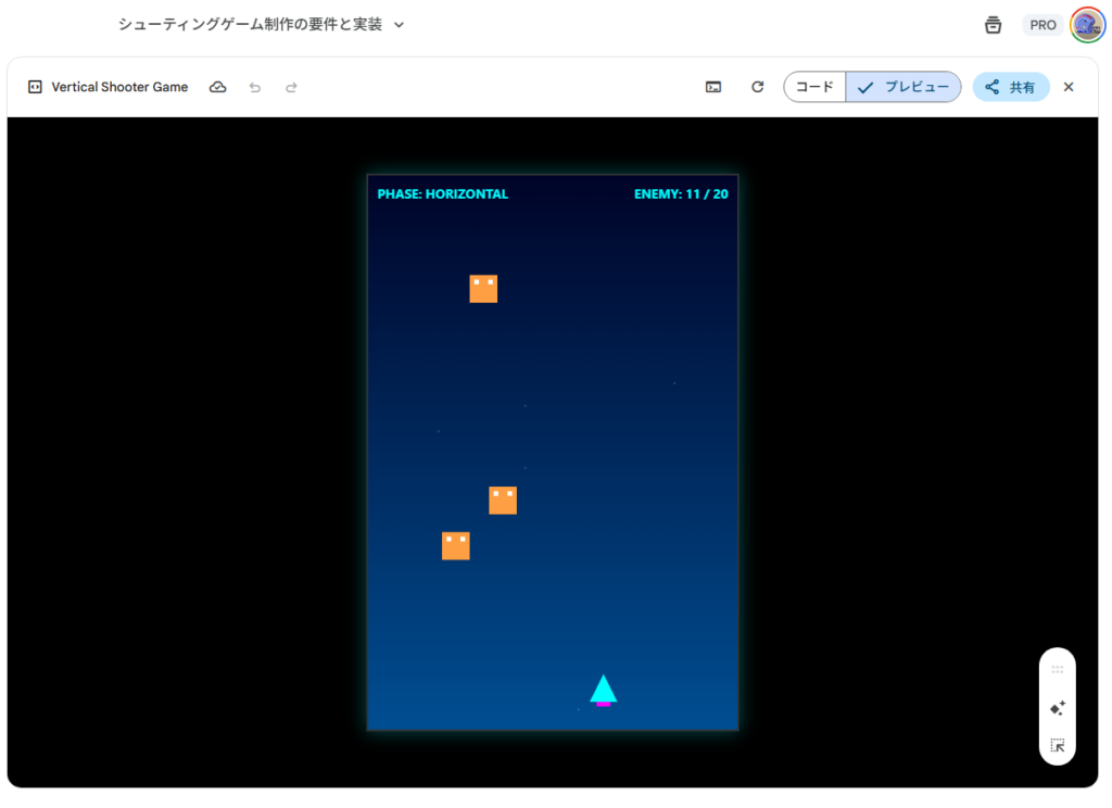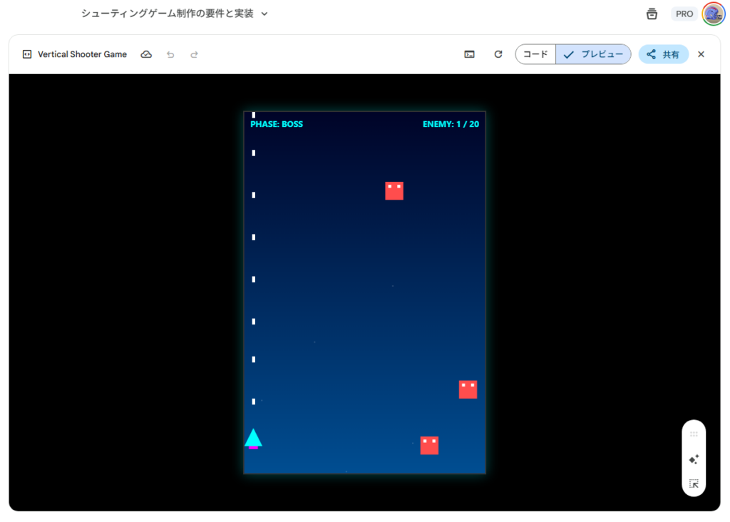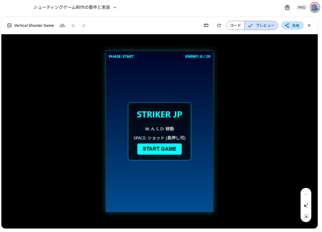 まずは、Gemini3.0で縦スクロールシューティングゲームを制作していきたいと思います。Geminiに指示するプロンプトとして、下記のようにしました。