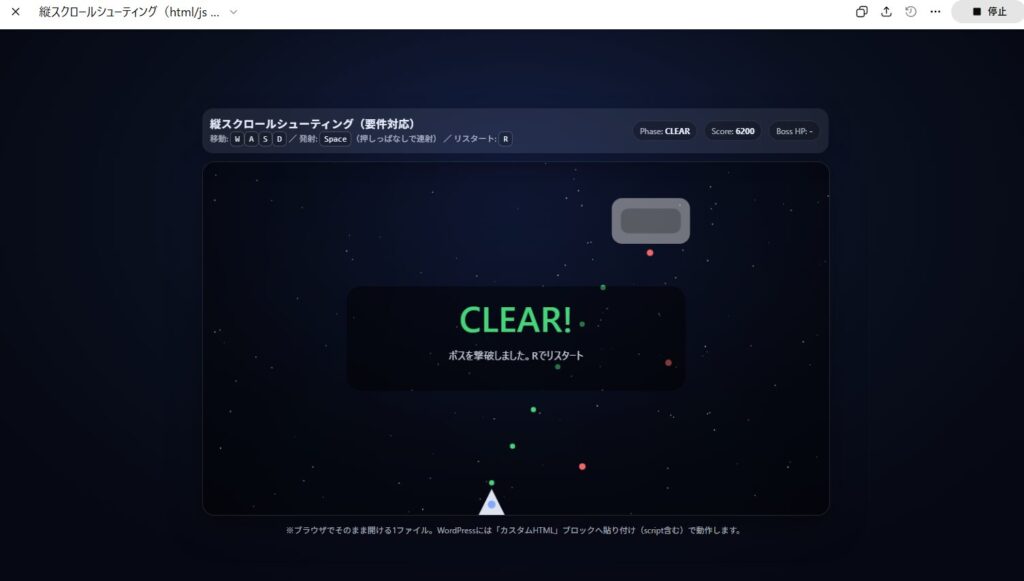 簡単にプレイした限りでは、致命的なバグはなく、プロンプトの指示に対してかなり忠実に再現されている印象でした。