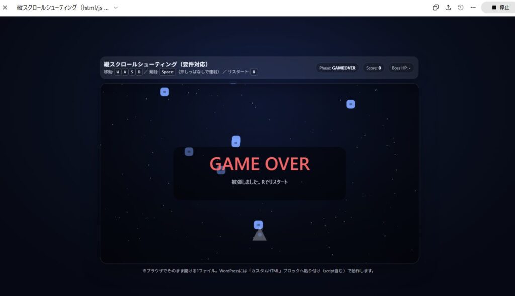 ゲームそのものについて、初回生成時のものを簡単にプレイした限りではGemini3.0とChaGPT5.2ともに致命的なバグは発見されませんでした。