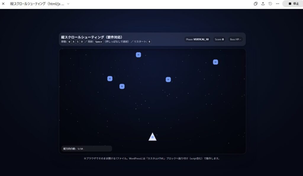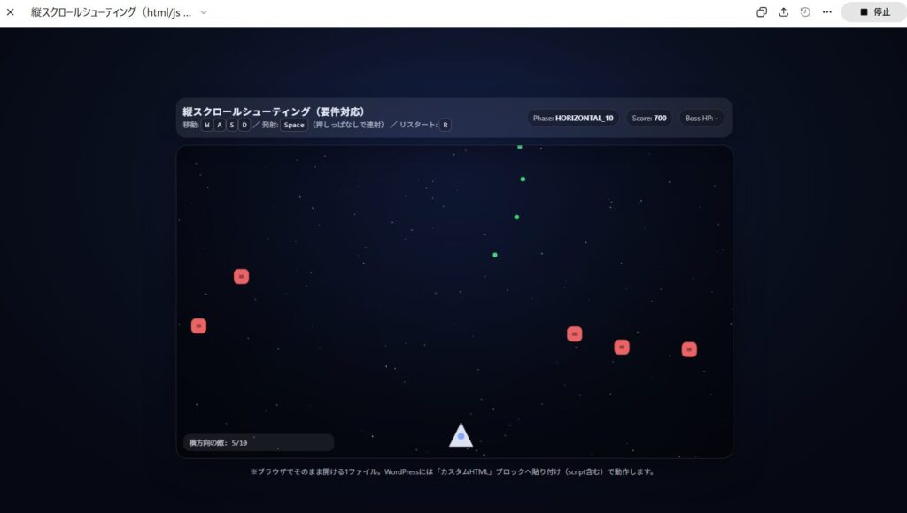 また、敵キャラの動きについて、プロンプトでは自キャラ向かって直線的に動くとしていますが、実際は垂直・水平に動いており、自キャラに向かってくる感じはしませんでした。
