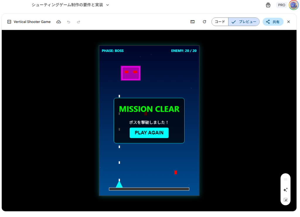 ボスキャラについても、要望通り自身で球を発射して、20発当てたら倒れるようになっていました。ボスキャラの球の動きについては、プロンプトで指定していませんでしたが、自キャラに向かって直線的に動くようになっており、ゲーム性が高いと感じました。