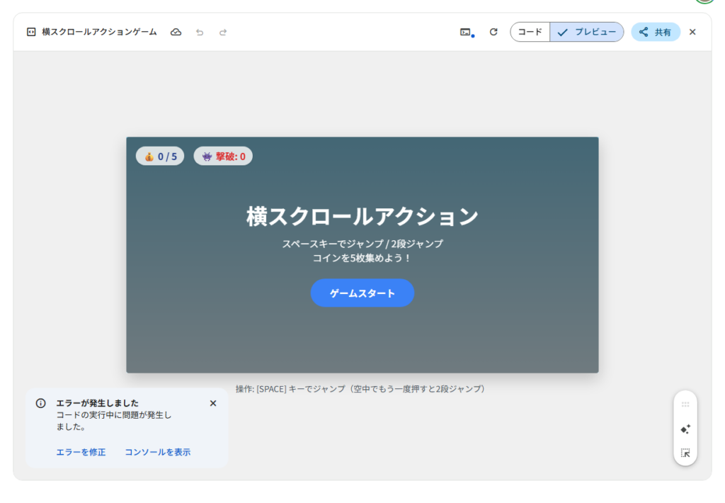 生成時間は1分程度でずいぶん早く生成できたかなと思ったのですが、画面左下にエラーが発生しましたという表示が出てきました。特に何も考えずに、「エラーを修正」を選んで、また1分後くらいに修正されたと思われるものが生成できました。