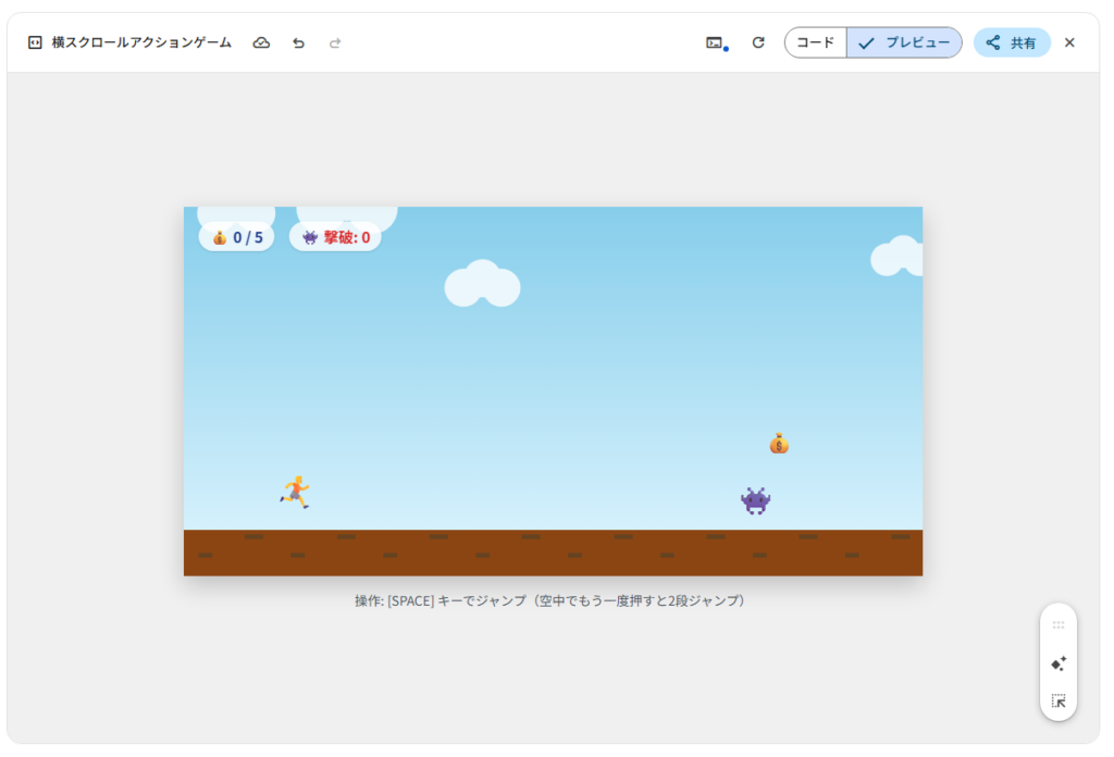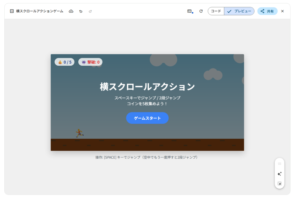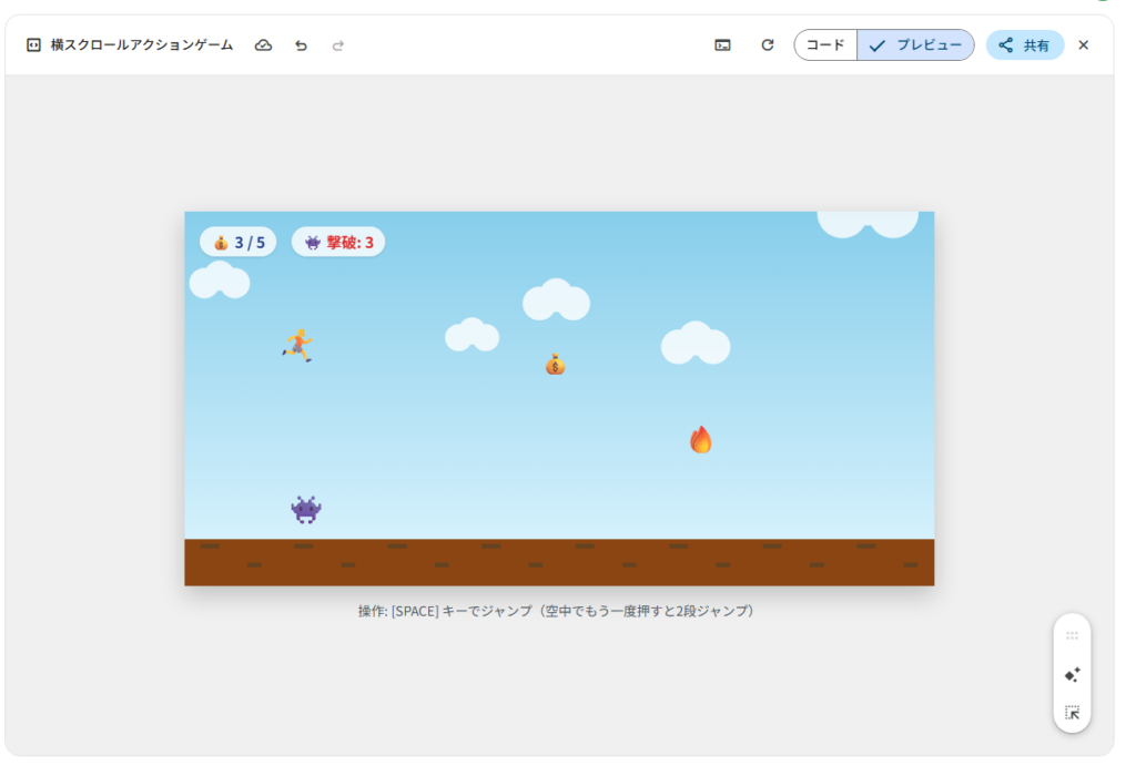 ゲーム内容について、指示通りスペースキーでジャンプ。2段ジャンプが可能になっていました。