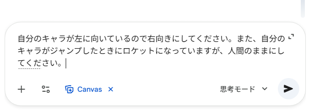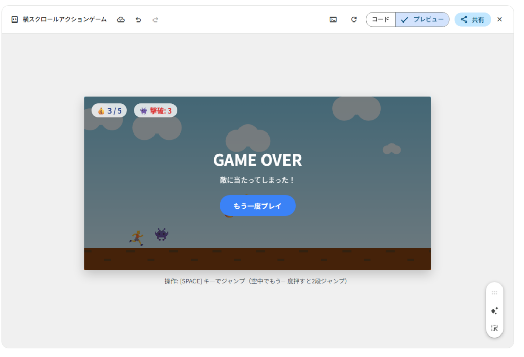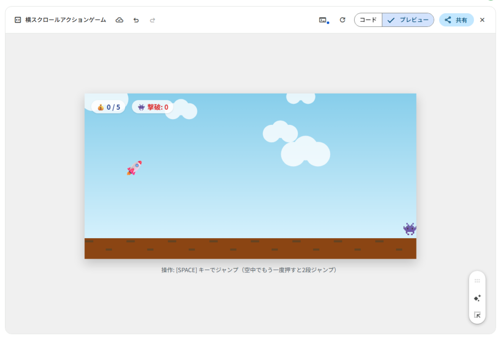 Gemini3.0では、初回の生成時にプレイヤーの向きやジャンプしてロケットに変身してしまうという表示上のバグがありましたが、修正依頼をかけることにより、簡単にプレイする限りでは、それ以上のバグは発見できませんでした。