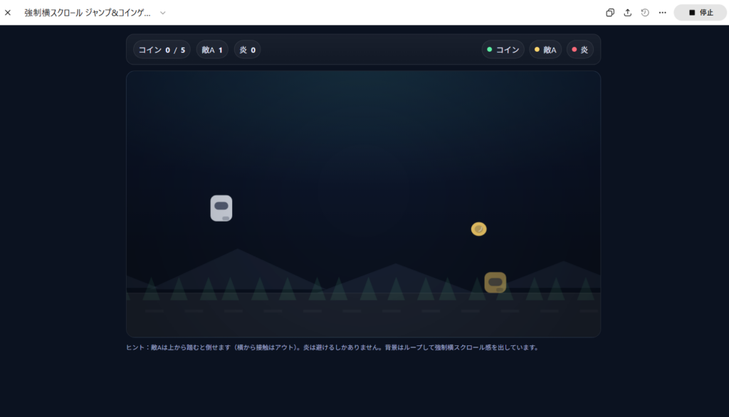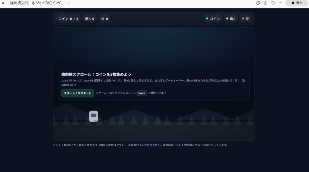 前回の記事では、Gemini3.0とChaGPT5.2で縦スクロールシューティングゲームを制作しました。今回も同じような感じで、強制横スクロールで、プレイヤーがコインを取るというジャンプゲームを制作したいと思います。
