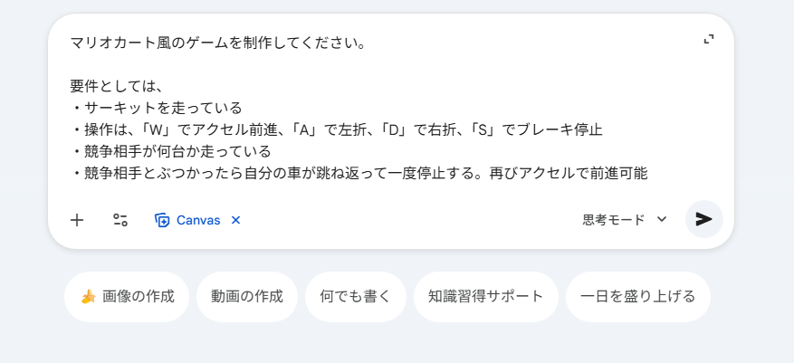 まずは、Gemini3.0でレーシングゲームを制作していきます。