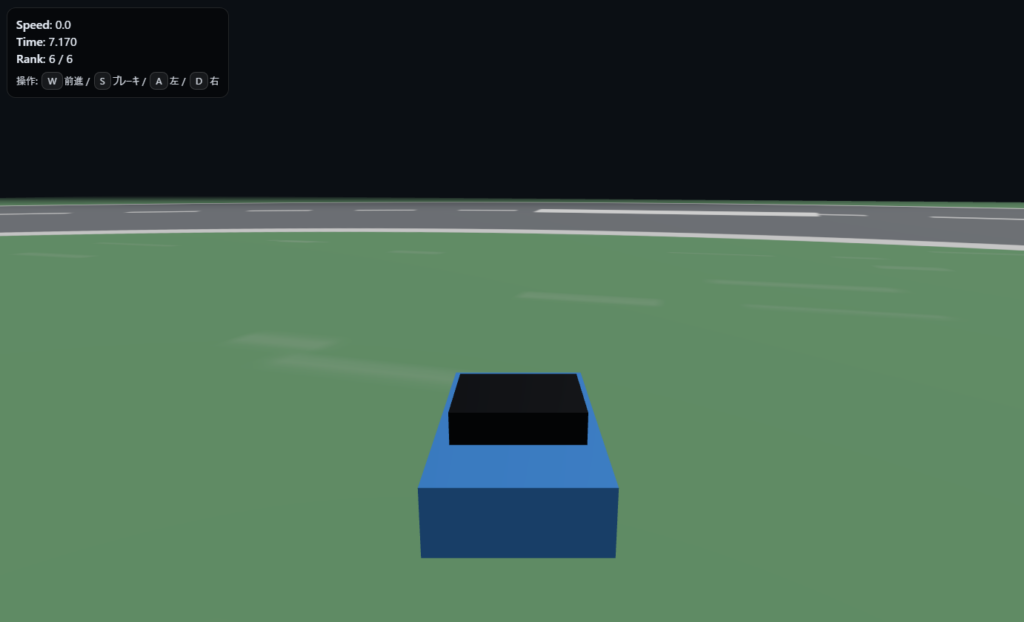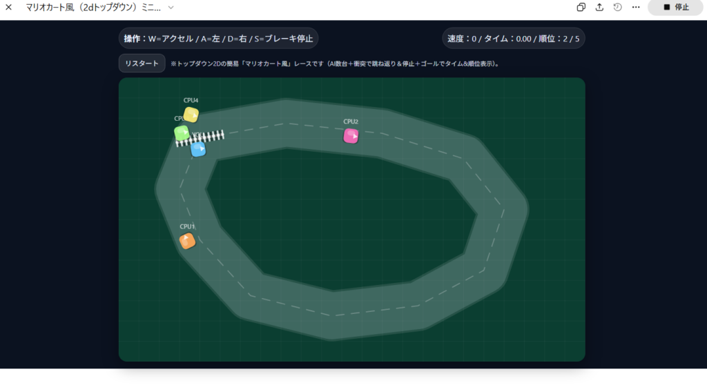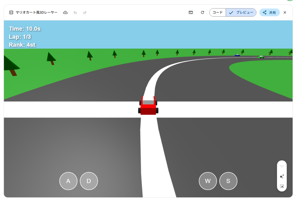 Gemini3.0では、車の速度が遅かったり、順位の表示に気になる点がありましたが、車自体は普通に操作でき、3D風のレーシングゲームぽいものは出来ていたように思います。